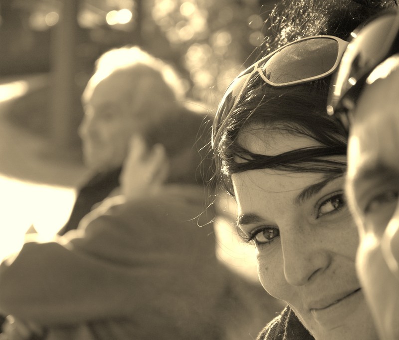 le choix du traitement photo jaunie ne convient pas au sujet trop actuel (lunette de soleil) et le personnage au premier plan est gênant ainsi que le menton coupé de la jeune femme et l'arrière plan à part cela dommage car le regard et le sourire espiègle sont eux intéressants