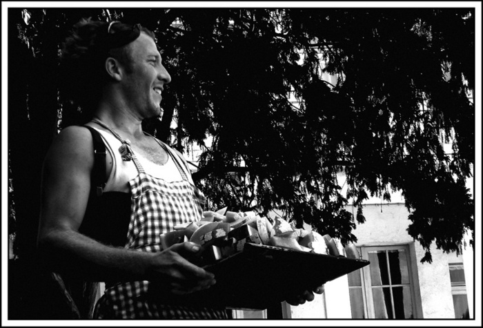 Photo prise lors d'une des representations de la compagnie du Tapis Volant au festival de Chalon dans la rue cette année. Chaleur accablante, énorme luminosité dans cette cours d'école . Heureusement que Jérémie avait préparé pasteques et melons pour le public !