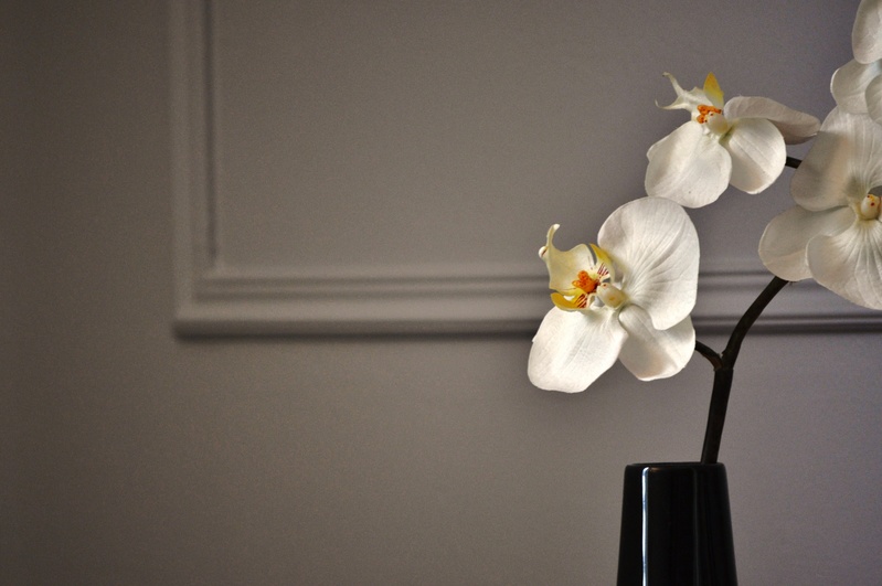 Si tu deplaces le vase gràce à un support quelconque tu vas certainement faire un jolie photo en exploitant l'idée de la ligne (la moulure). C'est à creuser.