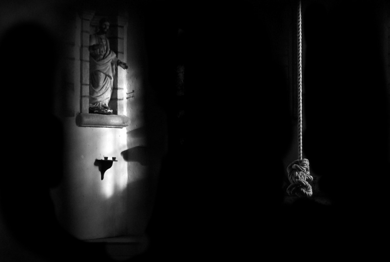Je suppose que c'est pris dans une église ou une chapelle, que cette corde est là pour faire sonner les cloches... Enfin c'est la vision que j'en ai.