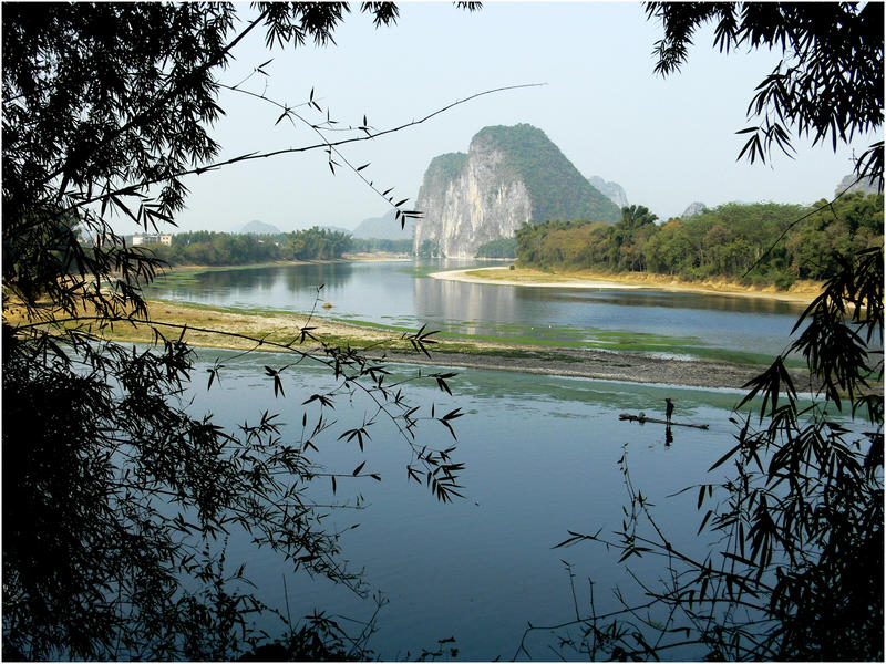 Dommage qu'il y ait trop de bambous. Ce qui empêche de profiter de ce beau paysage et de cette embarcation qui glisse sur l'eau et qui est très importante dans la compo, je trouve.
