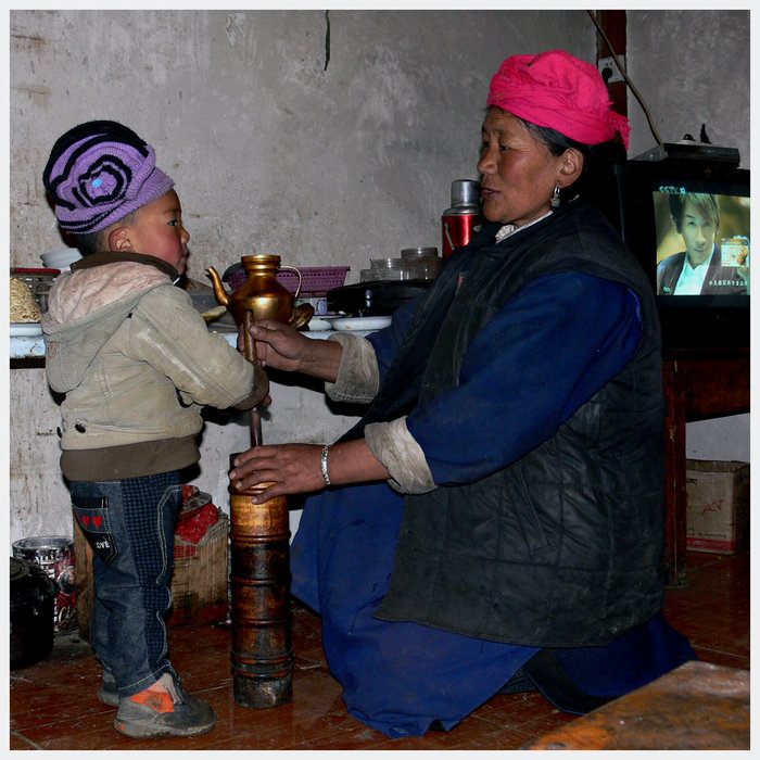 Dans une maison Tibétaine, nous assistons à la préparation du beurre de yack. Ensuite cette dame nous a gentiment offert une tasse de thé au beurre de yack....grande convivialité mais le thé avec cette préparation est vraiment ignoble....!