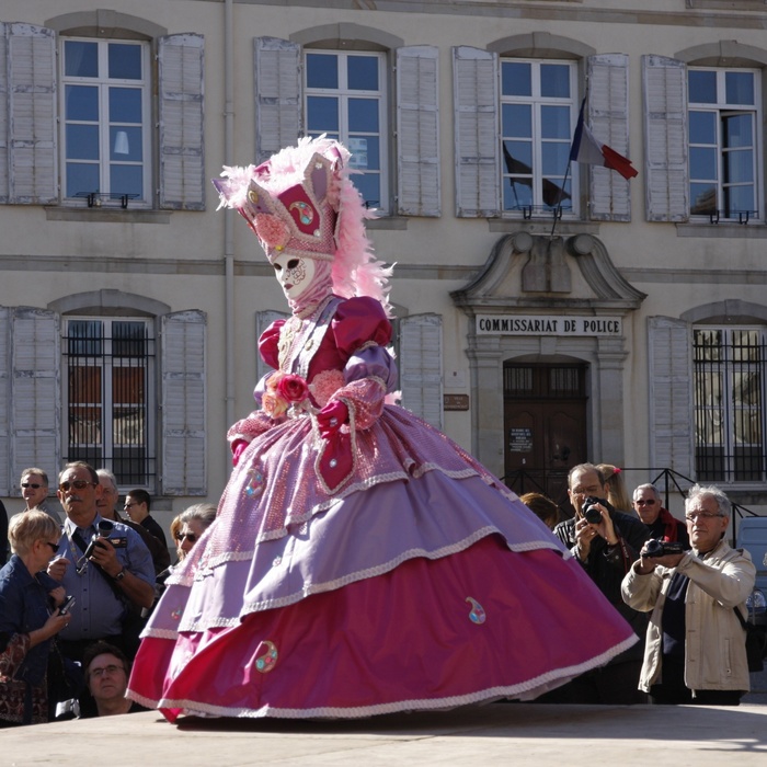 il aurait fallu prendre en contre-plongée pour sortir la foule du champ, en plus cela aurait donné avec la robe de belles lignes à exploiter tout en ré haussant le mystère du masque. Vous avez un 50mm, profitez en, visez le masque, ouvrez plus !