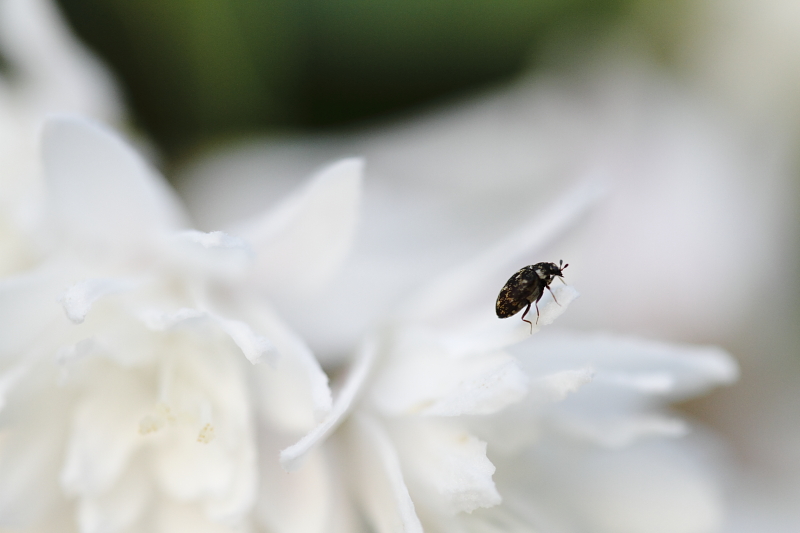 Une intéressante photo, même si l'insecte le parait moins... En ce qui me concerne, j'aurais vu un cadrage avec la bestiole sur le point fort (règle des tiers) en haut à droite, avec peut-être l'avantage d'enlever du vert qui dépareille avec ce beau blanc. Peut-être une profondeur de champ plus importante afin de souligner les lignes de la fleur et ainsi donner de la consistance au support de la bébête. Bien que celle-ci sur son nuage est une idée sûrement intéressante...Quoiqu'il en soit, du fait du peu de particularité de cet animal, la mise en scène avec la fleur aurait rajouter de l'intérêt. La saison est propice, et de nombreuses nouvelles occasions vont te permettre de nous proposer des clichés encore meilleurs ;-)
