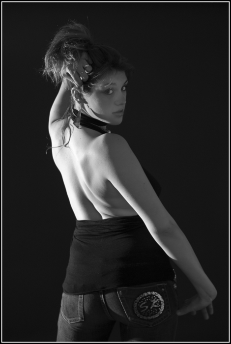 La pose est jeune et dynamique. Une seule source de lumière, je crois voir. Et pour ce style il t'en faudrait au moins une autre pour donner du peps au visage qui est trop doux . D'autre part la pointe du nez est plus sombre et c'est dommage.
