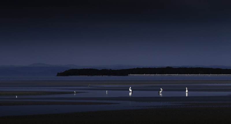 Ce bleu nuit est bien trouvé. Les lignes formées par l'alignement des oiseaux et le pont au fond sont très bien vus.