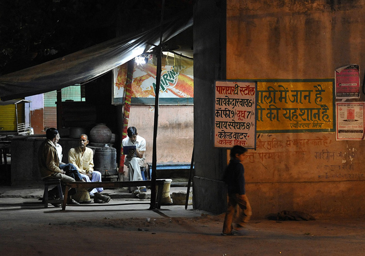 le calme de la soirée. deux plans distincts qui attirent le regard : les hommes d'une part et l'enfant d'autre part. Les lumières différentes font passer d'un plan à l'autre. Je remarque le modernisme : un des hommes pianote sur un ordinateur!