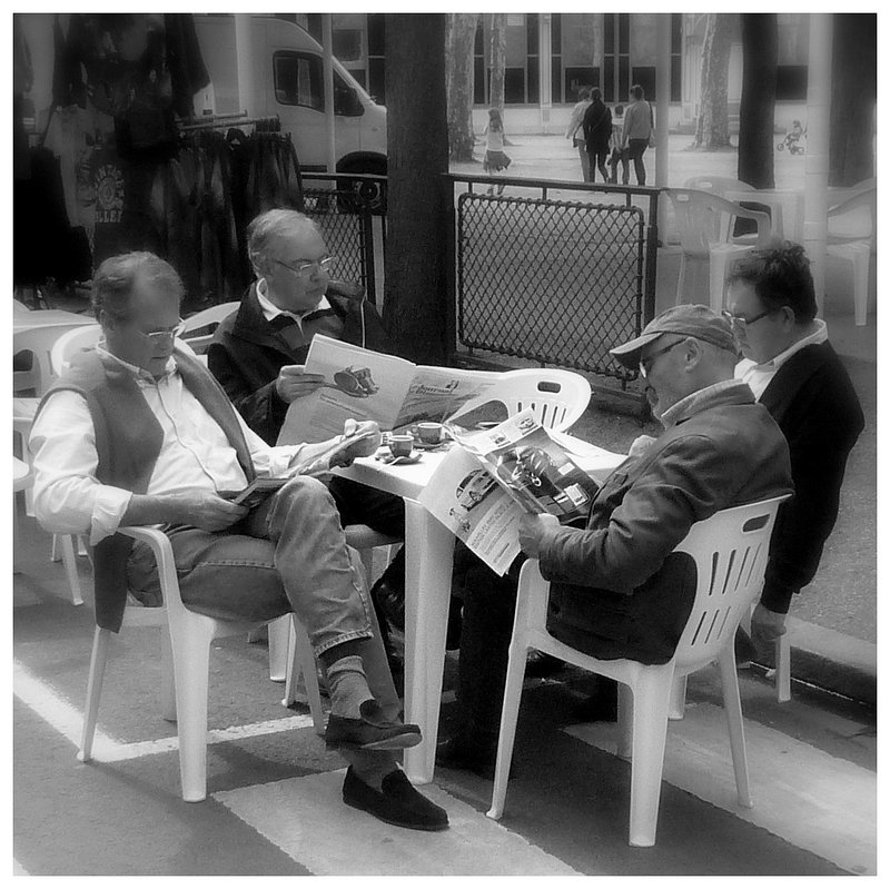 En te décalant sur la gauche je pense que tu aurais pu avoir le journal du 4e personnage. Le fond est très fouillis (camionnette, vetements...)et le flou apporté autour de la scène n'apporte rien, à mon avis.
