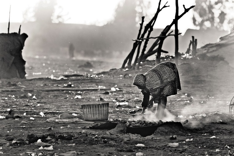 L'histoire : photo prise sur un îlot des "exclus" de Bamako à la tombée de la nuit. On peut apercevoir que cette femme (semble t il âgée) a une maladie de peau (traces blanches très marquées sur le visage). Cette scène m'a marqué, tous ces papiers, détritus,cette poussière, et sur son petit feu, elle réchauffe je ne sais quoi. Il ne me fut pas possible de m'approcher et de communiquer avec elle malheureusement. Techniquement, photo assez difficile à réaliser avec une lumière très très basse et pas mal de contrastes.