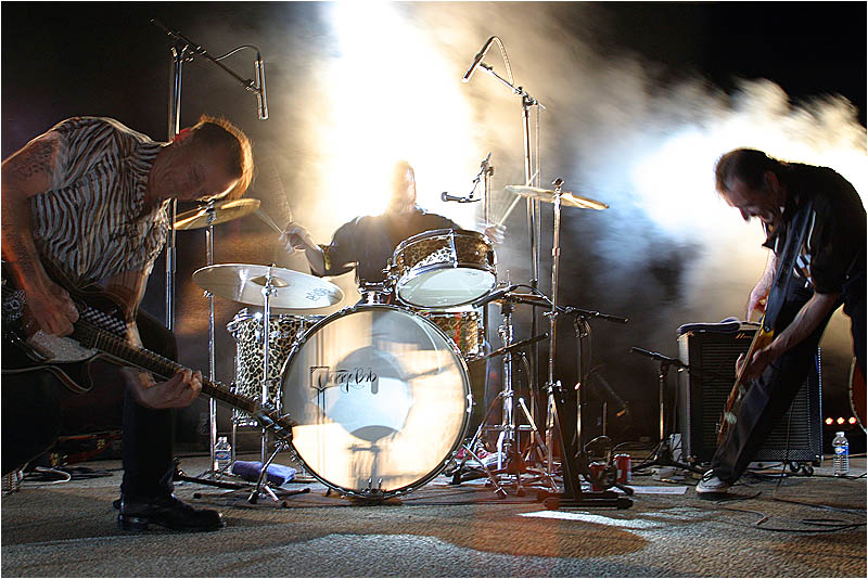 Belle scène tout dans le mouvement des guitaristes. Le batteur à la moitié du visage enflammé ça chauffe.