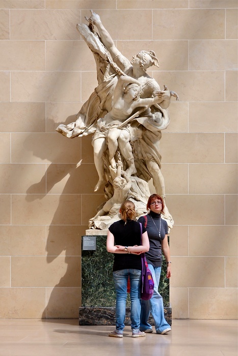 Monochrome chaud et classique et monochrome froid moderne, mais le tout très harmonieux...statisme des vivants et vivacité des statues...Les visiteuses regardent dans des directions inverses, tout comme les statues...un bel instant ...
