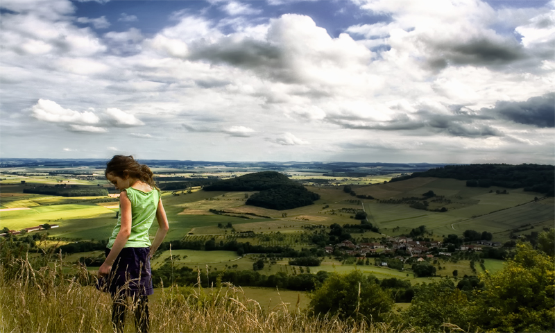 j'aime cette photo, j'imagine que ces nuages surex sont volontaires, et alors je comprends mieux le regard détourné de la jeune fille; l'avenir de notre jeunesse est lumineux... Peut-être un cadrage plus large pour impliquer totalement dans le paysage et donner une valeur d'échelle plus forte, amha. Dans tous les cas, j'aime bien