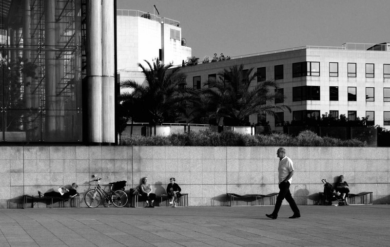 Je pense qu'il aurait fallu cadré plus serré pour éviter cette sensation de déséquilibre donnée par l'immeuble de gauche et accentué par la pente. Pour éviter ceci et avec le même cadrage il aurait fallu un piéton plus proche de l'objectif, en premier plan.