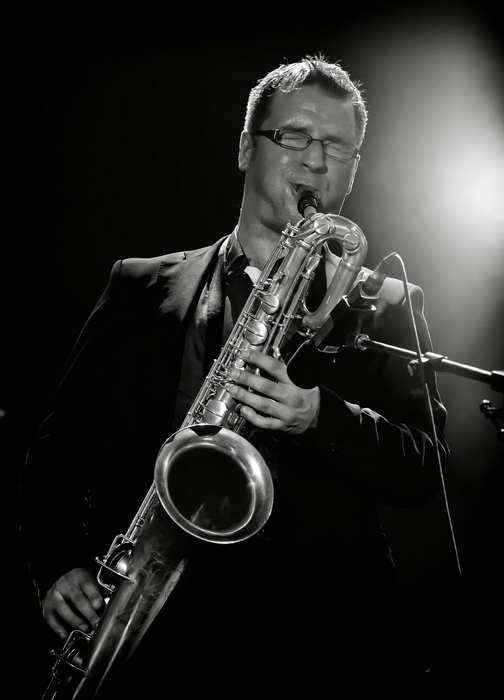 Ruquier qui joue du saxo sais plus quoi faire pour ce faire remarquer celui là. J'aime beaucoup la diagonale avec le saxo, le n/b, l'expression un peu moins ce halo blanc derrière qui gêne un peu la la lecture amha. Belle tof