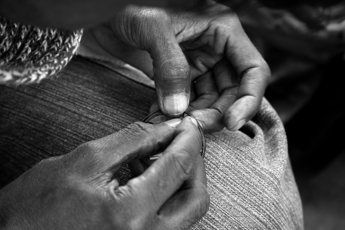 de belles mains d'artisan bien contrastées et concentrées sur leur tâche, c'est parlant! J'aurais peut-être recadré de façon à ce que le flou du visage, trop important, n'apparaisse pas; ou alors rendre le visage plus présent sur la photo et moins flou, car ça peut être un plus ici. Je me demande si un format plus carré ne mettrait pas ces mains en valeur. Sinon j'apprécie le choix de l'ouverture et le flou du fond.