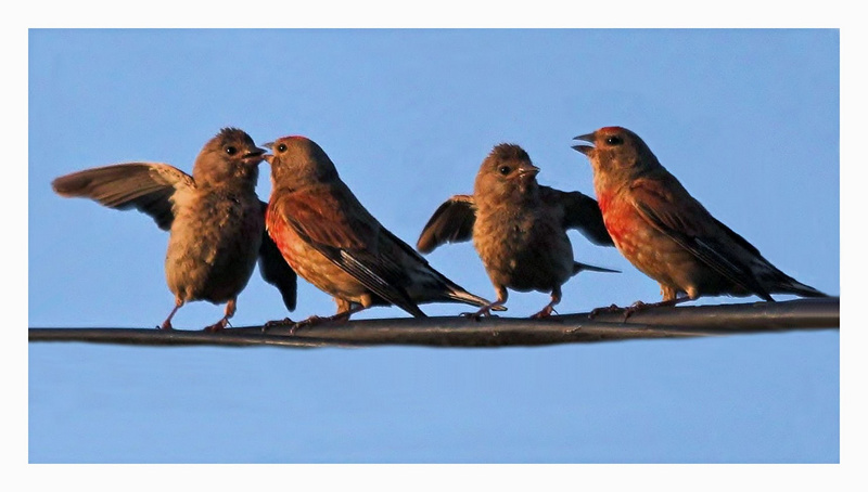 A force de les observer, j'ai, ce soir là, passé plus d'une heure à les regarder faire juste avant le coucher du soleil. Etonnant de voir surtout les papas linottes venir remplir l'estomac de leur progéniture, pour la nuit. Contorsions de l'adulte pour régurgiter les graines entières ou des larves énormes..et les bb de tirer dessus.. une série de + de 60 photos de scènes plus extra les unes que les autres...