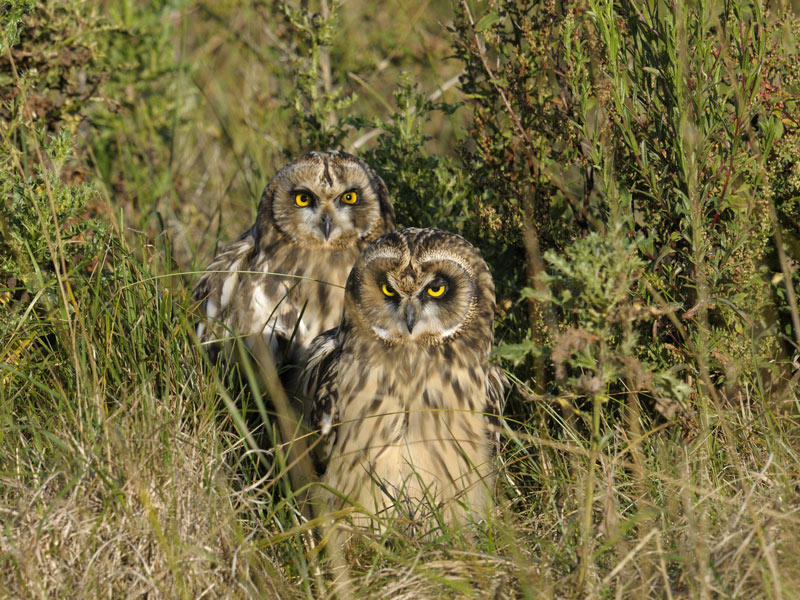 deux jeunes hiboux des marais attendent le ravitaillement...