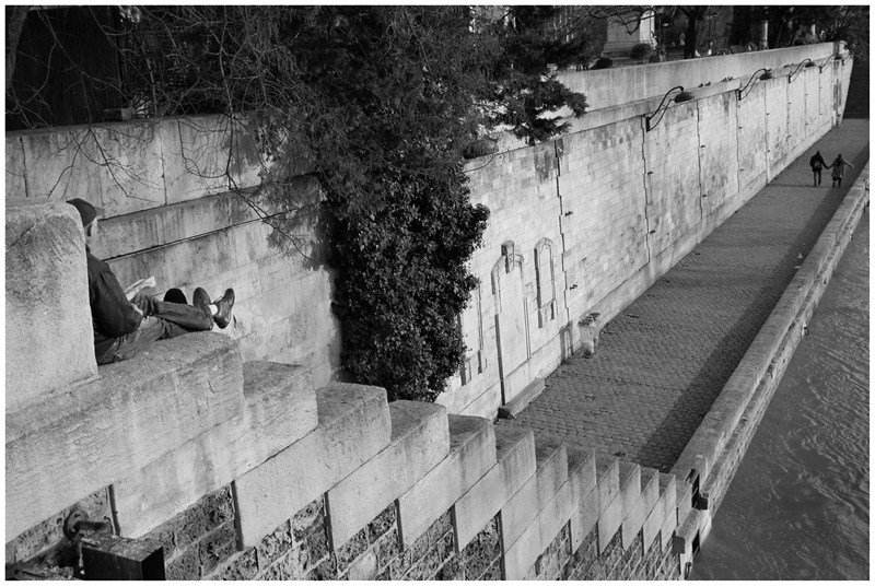 Très dynamique, cette compo. Les trois personnages sont deviennent essentiels à la force de cette image. Scène intemporelle, choix du noir et blanc judicieux.