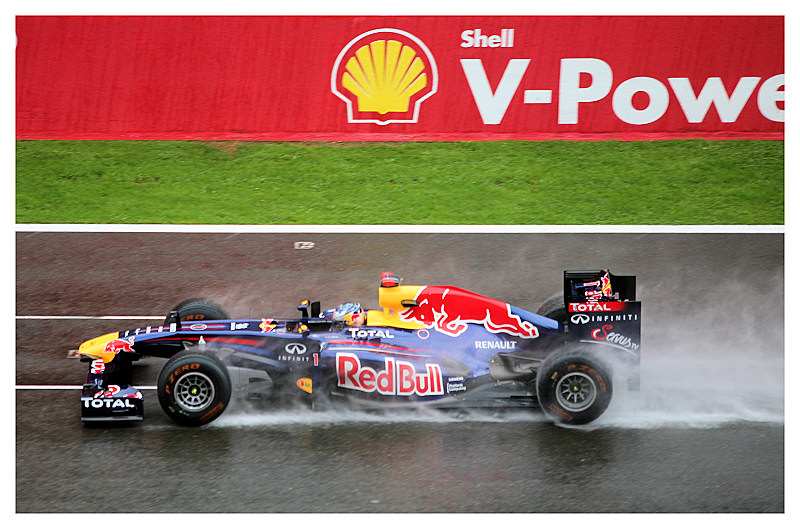 Vu la gerbe d'eau, je n'ai pas trouvé necéssaire de faire un filé pour montrer la vitesse ( en pose lente on ne voit plus rien à cause de l'eau). Et il conduisait vraiement sans filet sur cette piste détrempée.