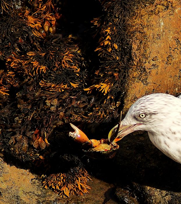 c'est extra comme l'ombre du jeune goëland vient faire un cadre pour le crabe !! belles couleurs également j'aurai peut-être juste aimé en voir un tout petit peu plus de l'oiseau