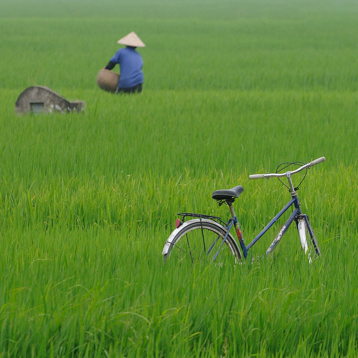 Photo prise au Vietnam. Pour associer les morts à la vie des villages, les tombes sont disséminées au milieu des rizières et autres cultures. Le vélo est de plus en plus souvent remplacé par le scoot...