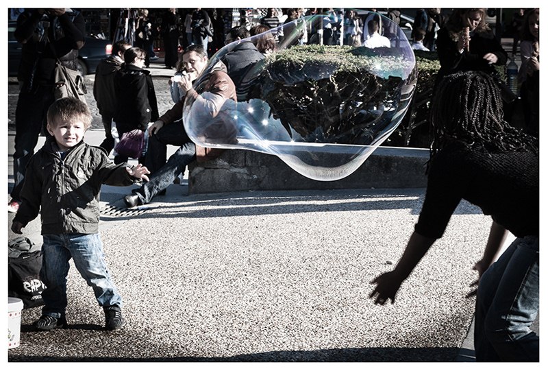 Il est parfois difficile de penser à tout quand on prend des photos de rue, sur le vif ; tous les paramêtres sont difficiles à gérer en une fraction de seconde. Cest vrai que le personnage au sandwich hors de la bulle serait mieux passé .... Bien belle PDV néanmoins ....