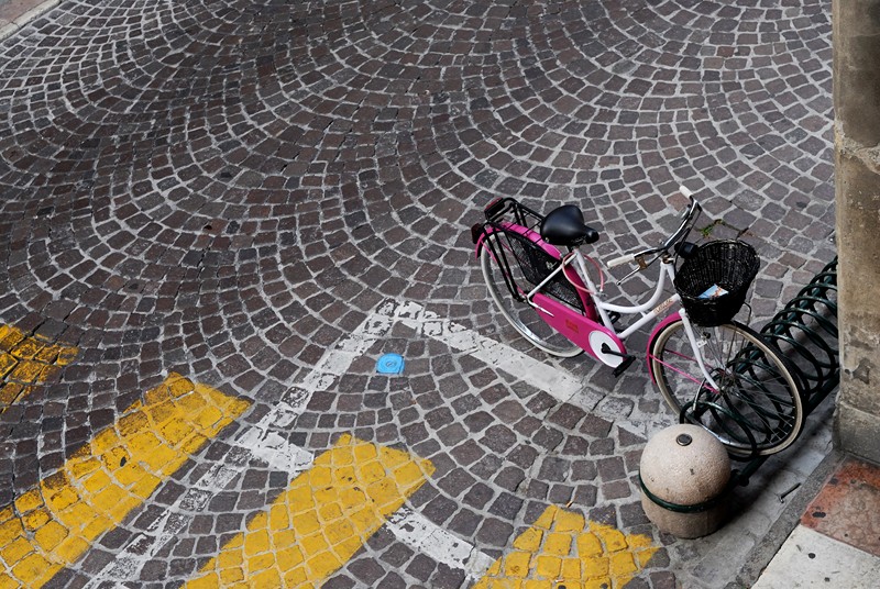 On peut aussi l'interpréter comme le rappel du coin en bas droit, faisant une diagonale avec le vélo et la ligne blanche ! peut-être qu'en panneau avec moins de pavés aussi?
