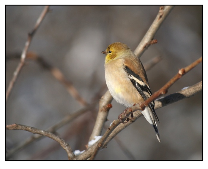 Superbe ce jaune dans ce fond terne!! Le petit bec bien net comme un aiguillon émoussé! Mais il neige chez vous