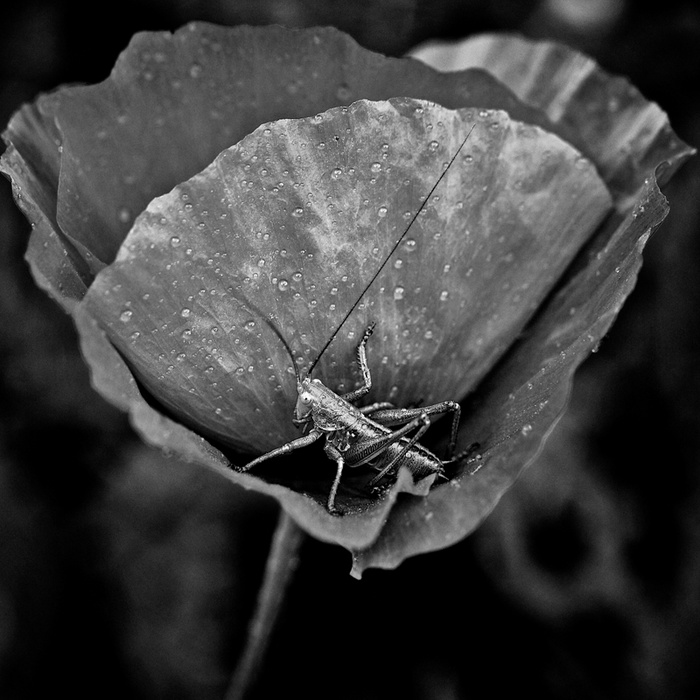 Très belle cette macro de coquelicot en N&B. Sympa ce criquet qui se désaltère Le rendu des gouttes d'eau sur les pétales est top.