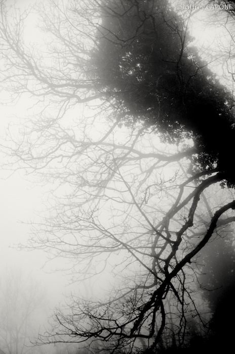 Les ambiances que l'on trouve actuellement..le brouillard qui se lève ou qui est troué par la lumière du soleil. Beau N & B. L'angle de pdv est sympa.