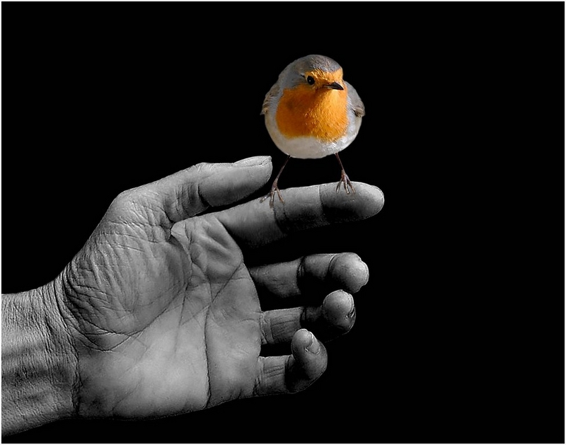 particulier ce montage (enfin je suppose): grosse main en noir et blanc et cet oiseau fin et coloré...