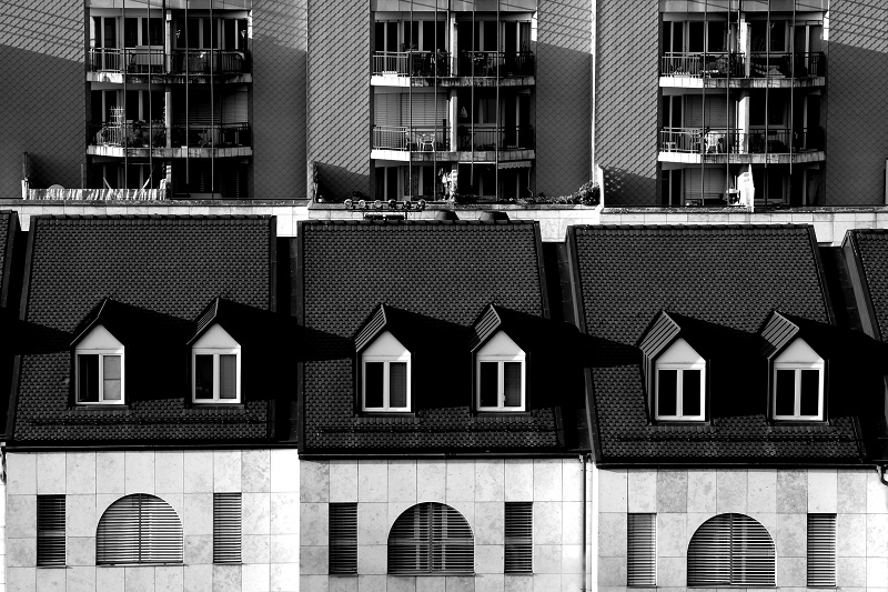 Belle opposition de style, servie par un N&B précis. Peut-être que j'aurais préféré une photo plus de face, moins de plongée pour mettre encore plus en avant ces fenêtres triangulaires, à voir ... Dans tous les cas, un coup d’œil efficace