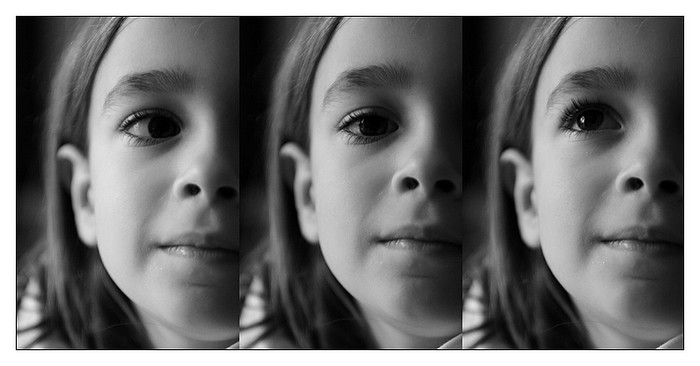 très joli portrait et nb bien géré. Dans le montage, j'aurais bien vu un petit espace (même largeur que le cadre) entre chaque image, pour respirer un peu. la pdc est impec