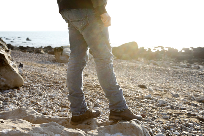 Une très forte lumière sur la droite, si forte que la mer est invisible, alors qu'elle l'est à gauche du personnage.