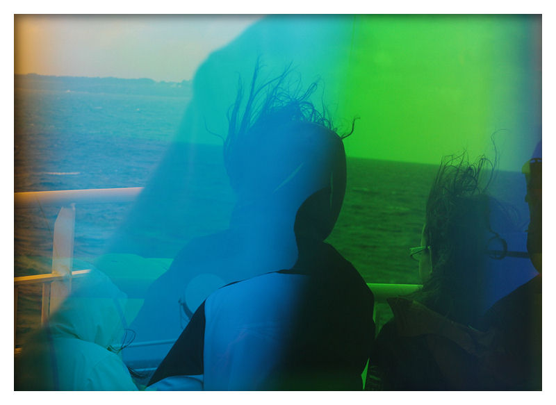 Alors que s'éloigne Belle-Île-en-Mer, les enfants contemplent, tristes et immobiles, cette mer qui fait le gros dos aujourd'hui. Le vent s'engouffre violemment dans leurs cheveux, créant d'improbables sculptures vivantes. Je suis avec mon appareil et son équipement si bizarre qui intrigue les passagers, et je tente, malgré le tangage du bateau, de créer aujourd'hui ces images de nos souvenirs de demain...