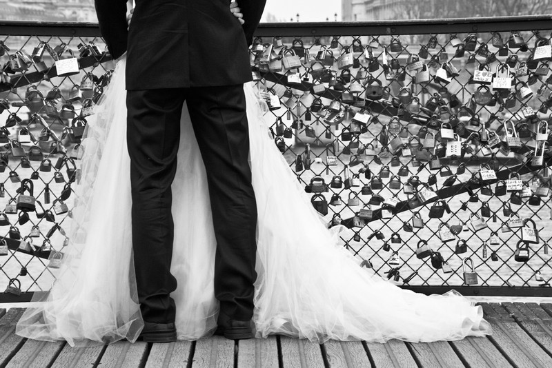 Il y a de l'idée, mais je trouve que la position des mariés manque un peu de lisibilité (on a du mal à voir si la mariée est de face ou de dos), et le traitement NB est un peu grisouille sur les cadenas.
