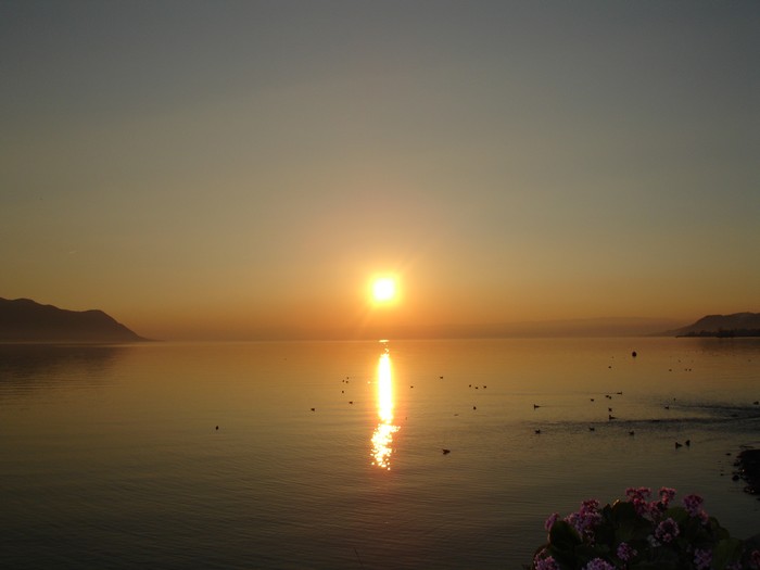 Bonne idée pour les fleurs en premier plan, qui donnent de la profondeur, et jolie photo. Peut être un coup de toshop pour mieux les éclairer. En ce qui concerne le cadrage, je trouve le soleil trop centré et te propose une variante.