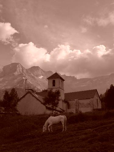 J'aime pas trop le traitement et le cheval centré avec le clocher dérange le regard amha