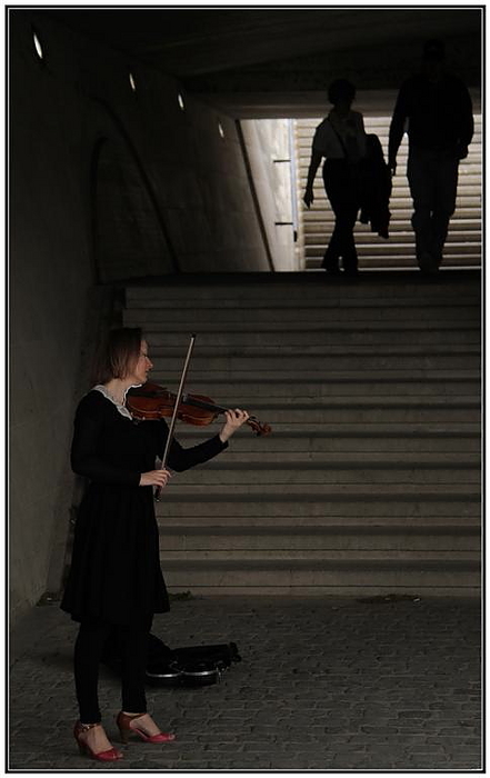 la couleur aussi : en NB, le violon serait bien triste, ici, sa couleur vient en contrepoint de celle de l'escalier.