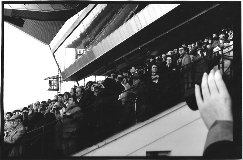 La foule regarde devant ou à gauche et la personne seule en premier plan regarde à droite.