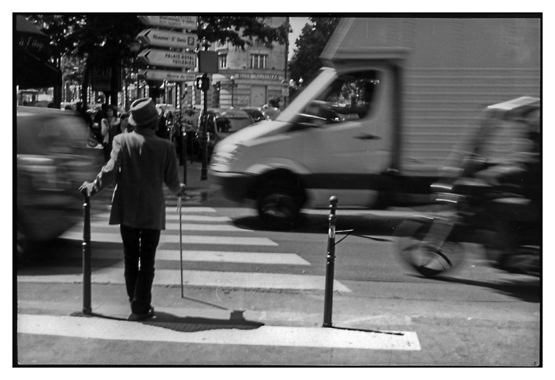 l'univers de tous les dangers, la ville. Ce sentiment est bien rendu par le mouvement des véhicules et le fait que le monsieur à la cane ne doit pas être bien sûr de lui puisqu'il se tient au poteau.