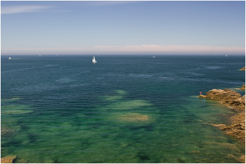 Un peu la même impression que Rachmine, et de ce fait, j'aurais je pense décalé le cadre vers la droite pour que cette partie de rochers soit plus présente et vienne "envahir" un peu l'omniprésence de la mer.