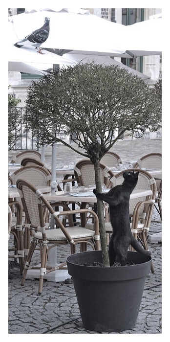 Le chat noir sur le petit arbre, avec le pigeon en haut...