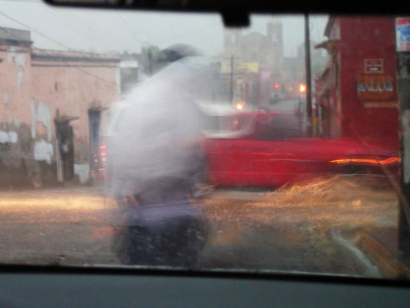 La photo est prise à travers le pare-brise de la voiture dans laquelle nous étions bloqués à cause d'un orage violent, et j'ai immortalisé un parapluie poussé par le vent....
