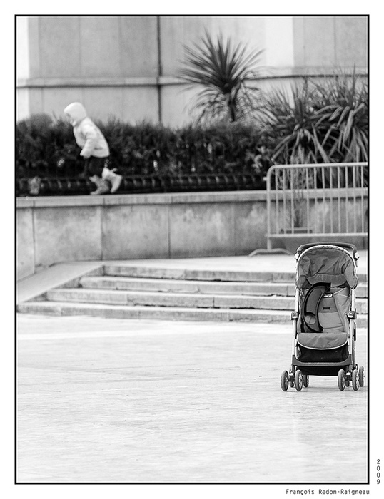 je la verrais bien en carré qui mettrait le gamin et la poussette sur une diagonale