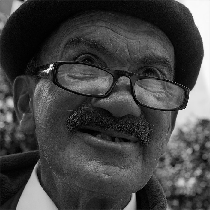 Maintenant cela ne me dérange pas plus que cela...L'expression est trés bien captée et surtout bien restituée.J'aime la ligne des yeux au dessus des lunettes.Malgré une bouche quasi édentée on devine une esquisse de sourire qui renforce bien ce visage dont les rides nous donnent une vague idée d'un âge avancé.Quant au NB,la lecture sur mon PC portable ne pourra pas être objective bien que je perçoive un manque de noir.