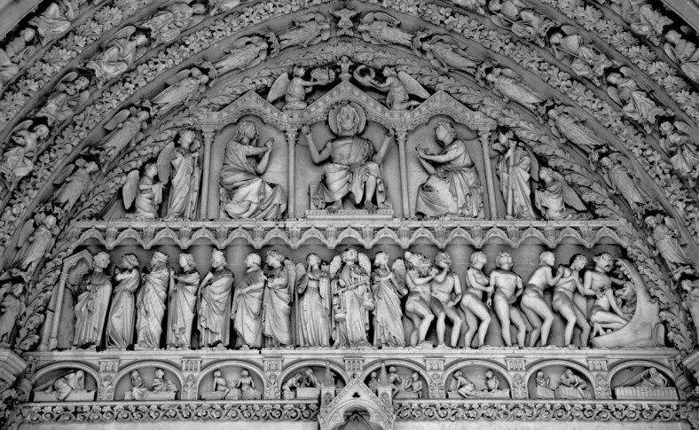 à droite où il y a les personnages nus c'est l'enfer, à gauche le paradis (d'ailleurs je pense à une erreur des sculpteurs, car le paradis devrait être à droite et pas à gauche ( senestre))