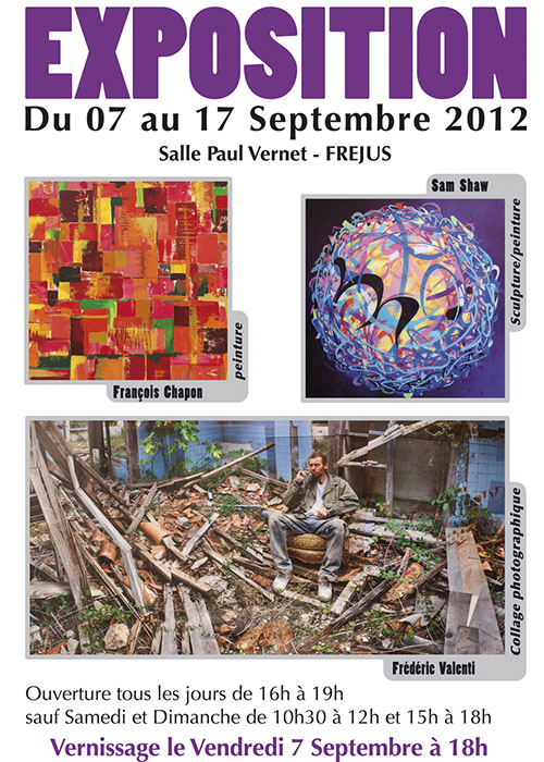 Si vous êtes dans le coin de Fréjus, début septembre venez donc nous voir. Pour ma part, ce n'est pas tout à fait de la photo, c'est du collage photographique .Pour vous donner une petite idée : http://www.frevalenti.com/fr/portfolio-14382-0-40-drup.html.