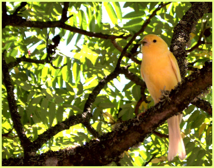 le cadrage et la compo sont super, j'aime les couleurs et l'effet du fond (on dirait un Douanier Rousseau). par contre petit pb de netteté sur le canari, c'est dommage.