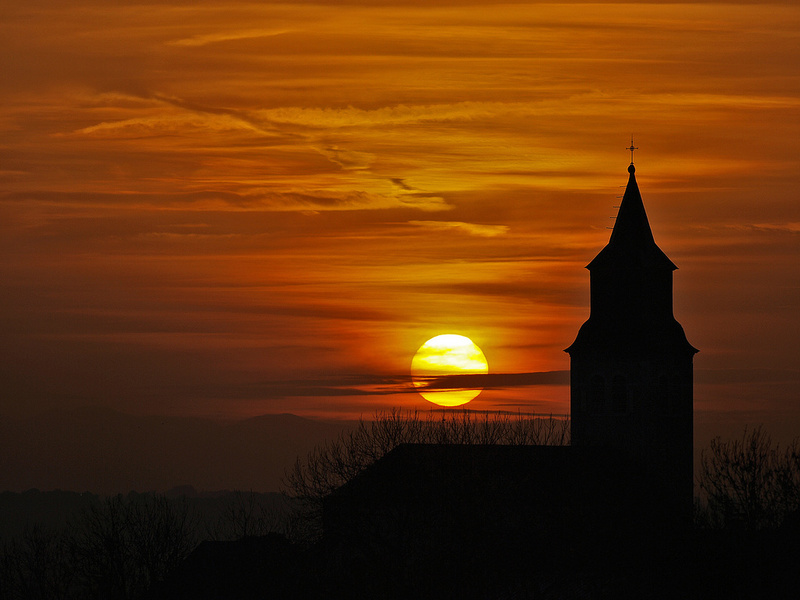 En carré, celle ci, ou alors encore mieux, il aurait fallu à mon avis sur la gauche pour que le soleil soit plus à gauche et pas superposé à l'église. Pour moi, la partie gauche de l'image est trop vide.